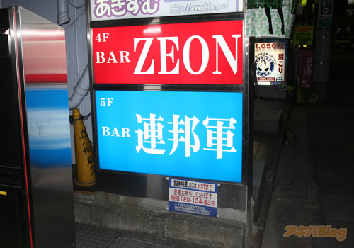 イオシスや妹系カフェNAGOMIなどが入居しているビルに、モビルスーツバー「連邦軍」&「ZEON」の看板が11日には付いていた。モビルスーツBarは「連邦軍」と「ZEON」の2つで別々のフロアで、『ガンダム』をコンセプトにしたBarみたいで、12月中旬の開店予定。スタッフ募集の張り紙では「1st・Z・ZZの世界観で営業していきます」とのこと。