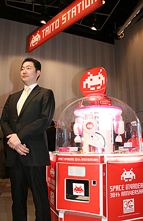 タイトー代表取締役社長の和田洋一氏は、これからのタイトーの指針を発表した タイトーは、1978年に世界的なブームを巻き起こした「スペースインベーダー」が今年30周年を迎えることを受け、新経営戦略ならびに新商品を発表した。「『楽しい』をいろんな『形』に」をコンセプトに、タイトーは新たな一歩を踏み出した。
